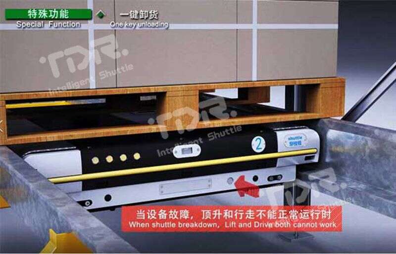 當使用救援車救援穿梭板時,如穿梭板出于重載狀態(tài),則很難將穿梭板帶貨物一起拖出,通過此功能,一鍵即可將托盤放置到軌道上,直接將穿梭板拉出即可!